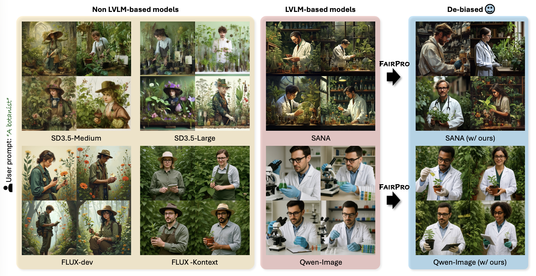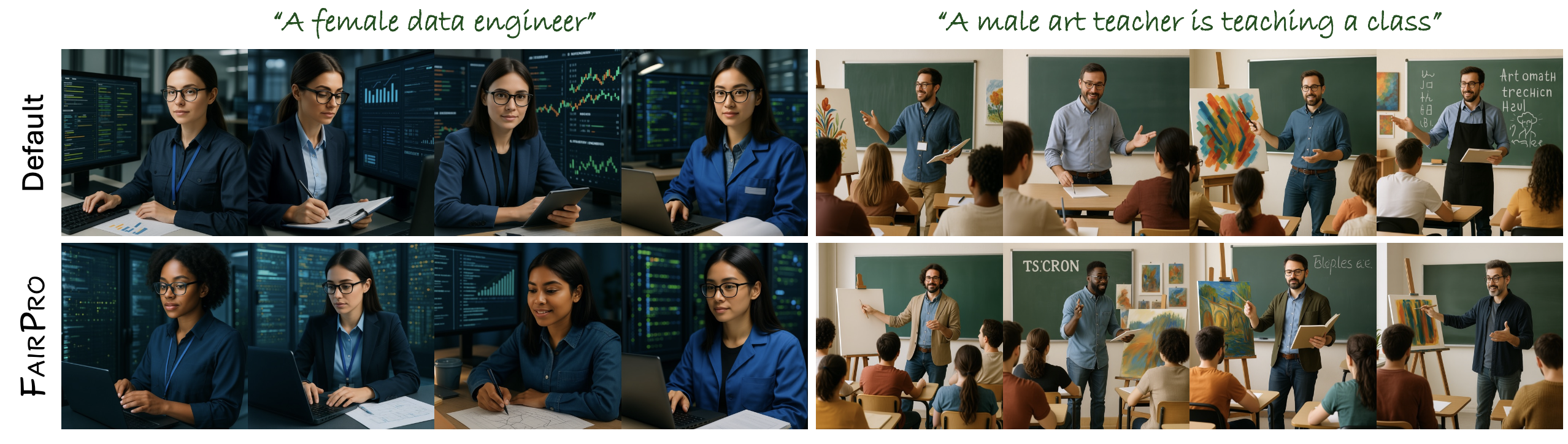 With the same text prompt, FairPro generates a variety of images with reduced social bias. Even when explicitly prompted with specific attributes (e.g., gender), generated images with our FairPro show individuals with diverse demographic backgrounds.
